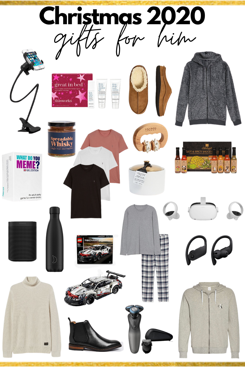 Lazy Arm Phone Holder | This Works Gift Set | Slippers | Fleece Hoodie | Whisky Marmalade | What Do You Meme Game | T-Shirt Set | Massager | Sauce Gift Set | Candle | Sonos One Speaker | Chilly’s Insulated Bottle | LEGO Car Model | Pyjamas Set | Oculus VR Set | Wireless Headphones | Sweater | Chelsea Boots | Electric Razor | Calvin Klein Hoodie